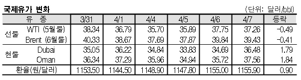 4월7일 국제유가는 미국 쿠싱지역 원유 재고 감소, 이라크 석유 수출 증가 등으로 하락했다. 4월7일 국제유가는 Keystone 송유관 가동 차질에도 불구하고 쿠싱지역 원유 재고가 증가한 것으로 알려지며 하락했다. 표, 그래프: <국제유가 변화> <화학저널 2016/04/08> |