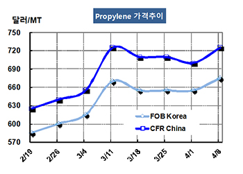 프로필렌(Propylene)은 의외로 상승세로 전환됐다. 프로필렌 가격은 4월8일 FOB Korea 톤당 675달러로 20달러 상승했고 CFR SE Asia도 725달러로 25달러 올랐다. CFR China 역시 725달러로 25달러 상승했다. 표, 그래프 : < Propylene 가격추이 > <화학저널 2016/04/12> |
