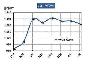 SM(Styrene Monomer)은 하락세가 본격화되고 있다. SM 가격은 4월8일 FOB Korea 톤당 1087달러로 14달러 하락했고 CFR SE Asia도 1129달러로 14달러 떨어졌다. CFR India 역시 1125달러로 14달러 하락했다. 표, 그래프 : < SM 가격추이> <화학저널 2016/04/14> |