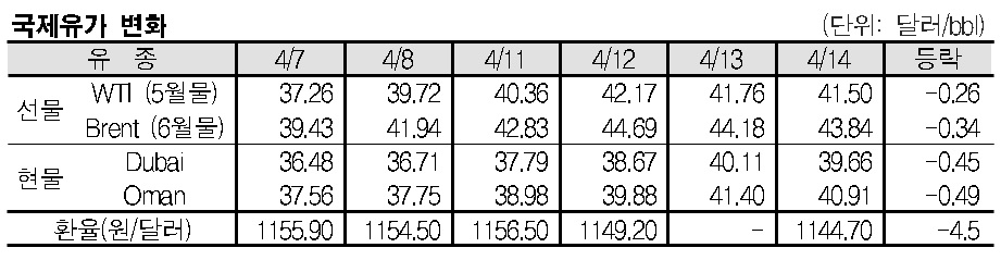 4월14일 산유국 생산 공조 기대감 저하 및 미국 달러화 강세 등으로 하락했다. 4월14일 국제유가는 산유국 생산 공조 기대감 저하 등으로 하락했다. 표, 그래프: <국제유가 변화> <화학저널 2016/04/15> |