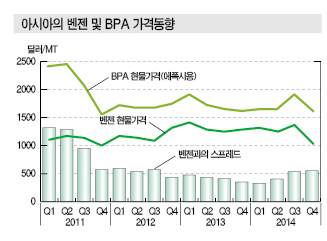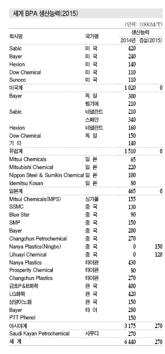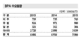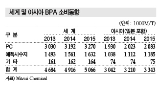 2015년 세계수요 500만톤 상회 표, 그래프 : <BPA 수요동향><세계 및 아시아 BPA 소비동향><세계 BPA 생산능력(2015)><아시아의 벤젠 및 BPA 가격동향> <화학저널 2016년 4월 25일> |
