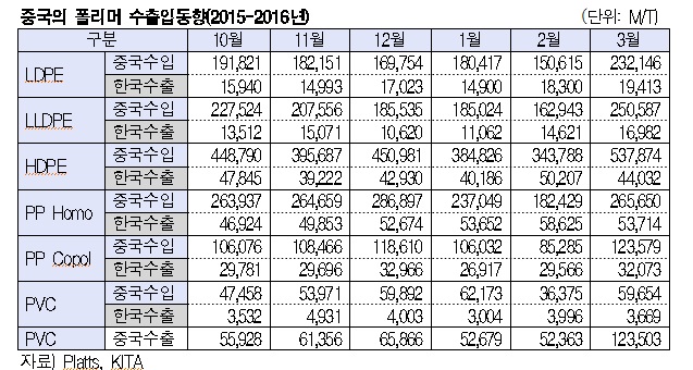 중국은 3월 합성수지 수입량이 급증했으나 한국산은 수입은 감소했다.