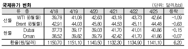4월25일 국제유가는 석유시장 공급과잉 우려, 미국 쿠싱지역 원유 재고 증가 등으로 하락했다. 4월25일 국제유가는 석유시장 공급과잉이 우려되면서 하락했다. 표, 그래프: <국제유가 변화> <화학저널 2016/04/26> |