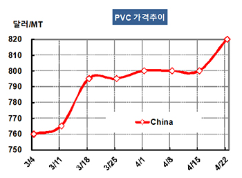 PVC(Polyvinyl Chloride)는 보합세를 뒤로 하고 상승했다. PVC 가격은 4월20일 CFR China 톤당 820달러로 20달러 상승했고 CFR SE Asia도 820달러로 20달러 올랐다. 다만, CFR India는 890달러로 5달러 오르는데 그쳤다. 표, 그래프 : < PVC 가격추이> <화학저널 2016/04/28> |