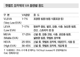 EVA는 VA 함량에 따라 다양한 용도로 사용되고 있으나 핫멜트 접착제용 EVA는 VA함량이 적게는 17%에서 많게는 45%에 달하고 있다.