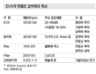 EVA는 발포 및 필름용에 주로 사용되고 있으며 핫멜트 접착제용으로는 5% 정도가 투입되고 있다.
