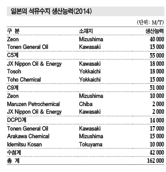 일본의 석유수지 생산기업들은 Toho Chemical이 2008년 C5/C9 공중합 플랜트 가동을 중단하고 C9 생산에 특화한 이후 2009년 말 Mitsui Chemicals이 철수하고 2012년에는 Maruzen Petrochemical이 C5에서 철수함으로써 생산능력이 총 14만톤으로 축소됐다.
