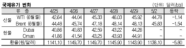 5월2일 국제유가는 주요 산유국의 원유 공급 증가, 미국 쿠싱지역 원유 재고 증가 등으로 하락했다. 5월2일 국제유가는 주요 산유국의 원유 공급이 증가하면서 하락했다. 표, 그래프: <국제유가 변화> <화학저널 2016/05/03> |
