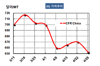MEG(Monoethylene Glycol)는 수요 부진으로 하락이 불가피했다. MEG 가격은 4월29일 CFR China 톤당 652달러로 18달러 하락했고 CFR SE Asia도 655달러로 18달러 떨어졌다. 표, 그래프 : < EG 가격추이 > <화학저널 2016/05/03> |