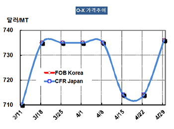 O-X 가격은 4월29일 FOB Korea 톤당 736달러로 22달러 상승했고 CFR SE Asia도 742달러로 22달러 올랐다. CFR China도 22달러 올랐으나 761달러로 CFR SEA에 비해 19달러 높은 수준을 형성했다.