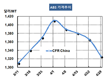 ABS(Acrylonitrile Butadiene Styrene)는 폭락행진을 멈추지 않고 있다. ABS 가격은 4월27일 CFR China 톤당 1325달러로 40달러 폭락했으나 CFR SE Asia는 1345달러로 변동이 없었다. 표, 그래프 : < ABS 가격추이 > <화학저널 2016/05/04> |
