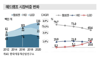 하지만, 헤드램프는 상대적으로 고가를 형성하고 있고 열이 많이 발생하는 부분이기 때문에 LED 채용이 다른 부분에 비해 더딘 것으로 나타났다.