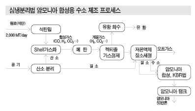 암모니아 제조용 고순도 수소를 제조할 때는 탈황 및 탈탄산 공정 후 액체질소를 이용하는 심냉분리법으로 CO, CO2, CH4, Ar 가스를 제거한다.