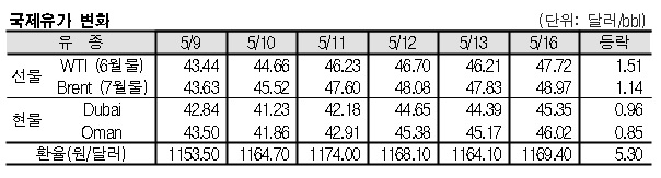 5월16일 국제유가는 골드만삭스(Goldman Sachs)의 수급타이트 예측, 미국의 원유 생산 감소 등으로 상승했다. 5월16일 국제유가는 골드만삭스가 원유 수급이 타이트해질 것이라는 예측을 발표하면서 상승했다. 표, 그래프: <국제유가 변화> <화학저널 2016/05/17> |