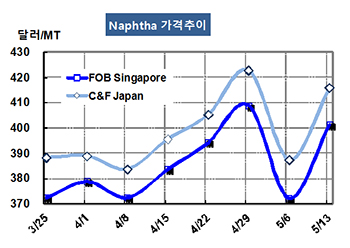 나프타(Naphtha)는 폭락한데 이어 다시 폭등했다. 나프타 가격은 5월13일 CFR Japan 톤당 416달러로 29달러 폭등했고 FOB Singapore도 401달러로 29달러 올랐다. 표, 그래프 : < Naphtha 가격추이 > <화학저널 2016/05/17> |