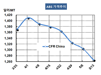 ABS(Acrylonitrile Butadiene Styrene)는 폭락현상을 재연했다. ABS 가격은 5월11일 CFR China 톤당 1265달러로 40달러 폭락했고 CFR SE Asia 역시 1285달러로 34달러 떨어졌다. 표, 그래프 : < ABS 가격추이> <화학저널 2016/05/18> |